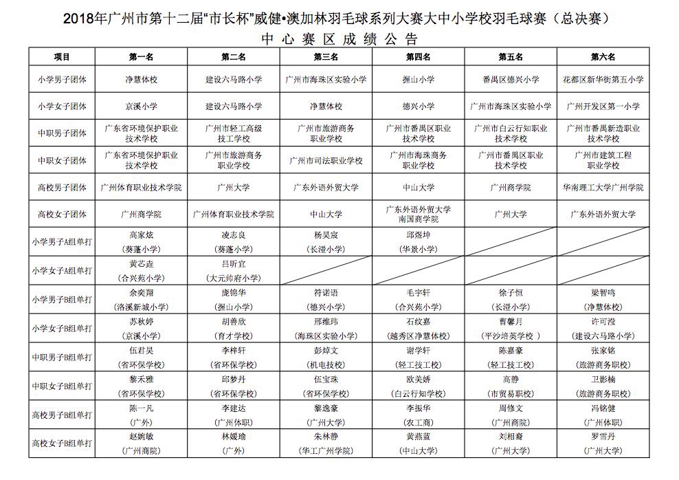 本届“市长杯”威健·澳加林羽毛球系列大赛大中小学校羽毛球比赛分预赛、总决赛2个阶段,项目包括男、女子团体以及男、女子A、B组单打。预赛历时一个多月,共有6000多名学生参与;经过激烈的角逐,来自114所学校的1000多名学生挺进总决赛,并最终决出了各参赛组别1-6名。