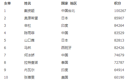 女单中国台北名将戴资颖位列头名,日本的奥原希望第二。印度的总决赛冠军辛杜升至第三,陈雨菲第四,山口茜第五西班牙的马林第六。何冰娇第七,泰国的拉特查诺第八,另外一位印度名将内瓦尔第九,美国华裔名将张蓓雯第十。李雪芮相比上周上升1位,目前排到第24。