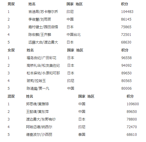 男双印尼组合吉迪昂/苏卡穆尔乔排名第一,李俊慧/刘雨辰位列次席,韩呈恺/周昊东第八,刘成/张楠跌至第十。女双陈清晨/贾一凡排在第五,日本组合福岛由纪/广田彩花第一。混双郑思维/黄雅琼和王懿律/黄东萍占据前两位,张楠/李茵晖位列第十。