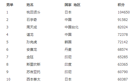 男单桃田贤斗位列榜首,石宇奇第二中国台北的周天成第三,谌龙升至第四。韩国名将孙完虎第五,丹麦的安赛龙第六,印尼的金廷第七。印度一哥斯里坎斯第八,印尼的小苏吉亚托第9,日本的西本拳太第10。林丹排名第13,申请保护排名的李宗伟第28。